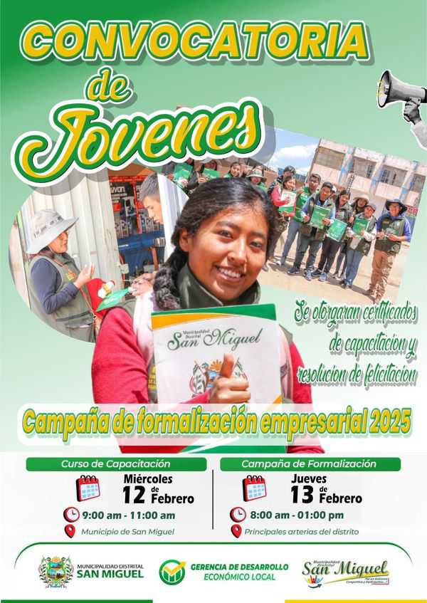 Te invitamos a participar en la Primera Campaña de Información y Concientización para la Formalización Empresarial. Aprende sobre los beneficios de formalizar tu negocio Recibe capacitación con certificación Obtén una resolución de felicitación por tu participación Inscríbete en la Gerencia de Desarrollo Económico Local o a través del siguiente enlace: https://docs.google.com/forms/d/e/1FAIpQLSdKIOYYeCNKmPtO5cH7wL47tCvjD-c3SP0KIMwk6oVIJ3fu2A/viewform Para mas información comunícate a los números: 957933721 – …