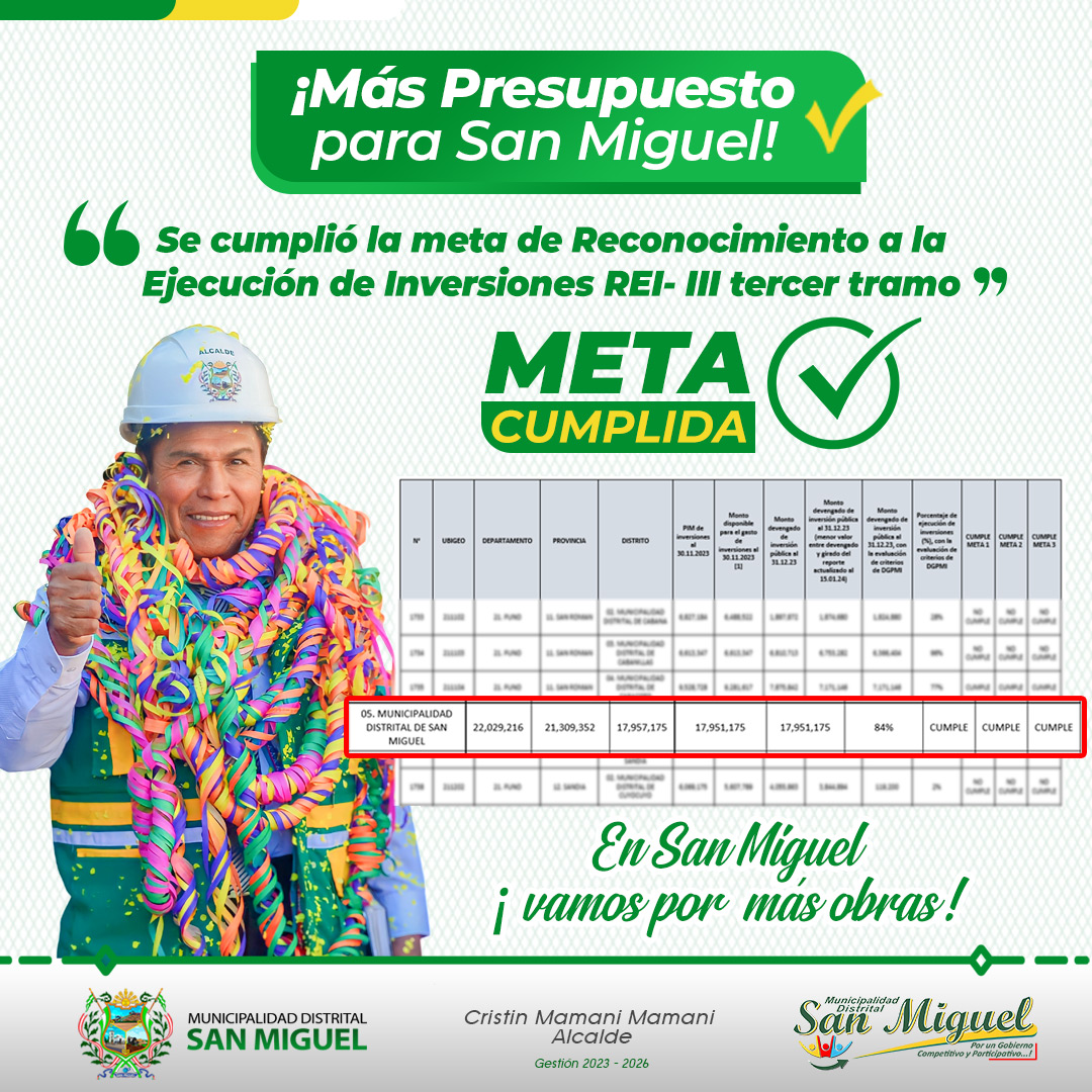 LA MUNICIPALIDAD DISTRITAL DE SAN MIGUEL LOGRÓ CUMPLIR CON LA META DE RECONOCIMIENTO A LA EJECUCIÓN DE INVERSIONES (REI).